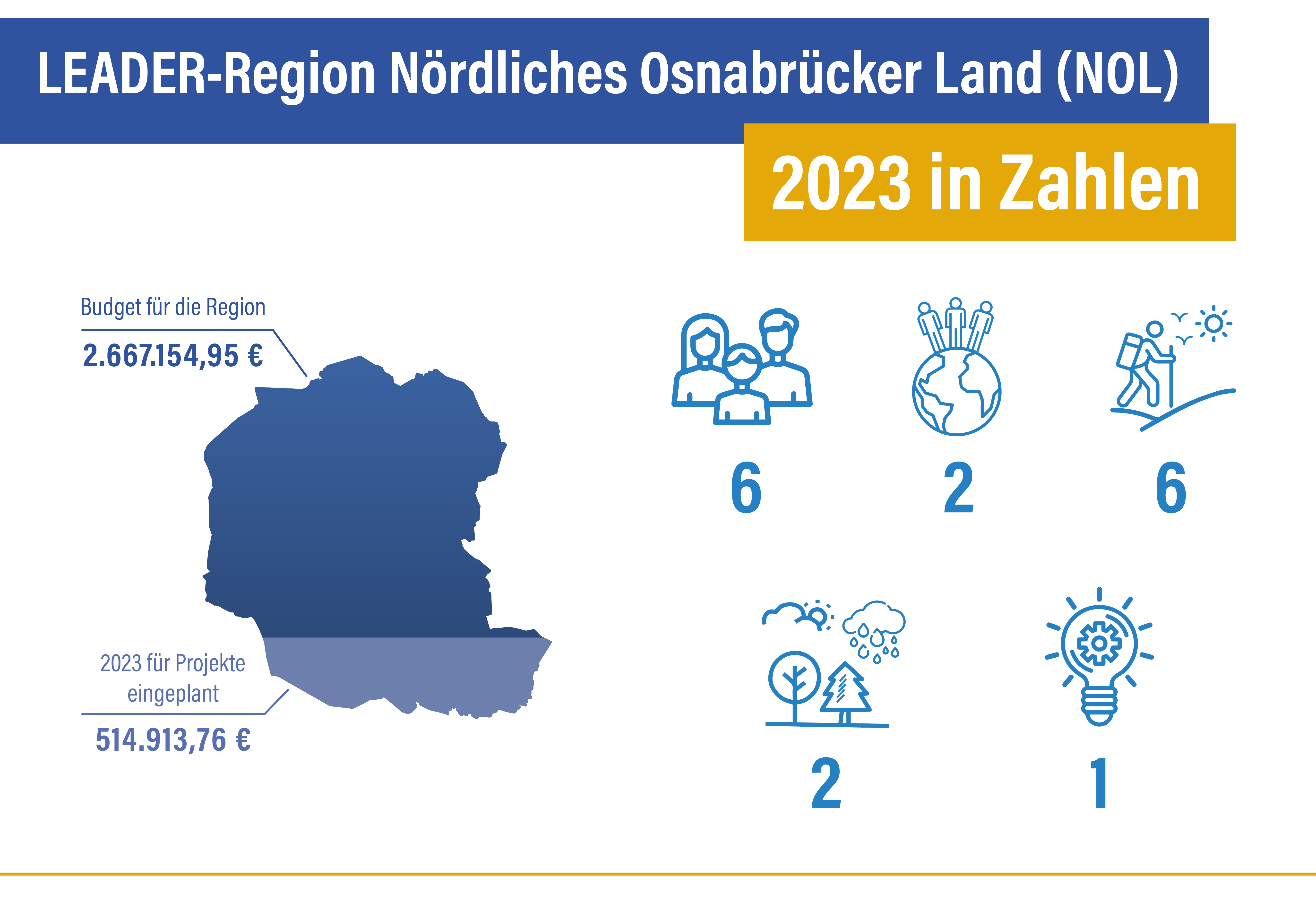 Die knapp 515.000 €, die 2023 verplant wurden, verteilen sich auf insgesamt 17 Projekte. Die meisten Projekte gab es in den Handlungsfeldern Tourismus und Soziales & Gemeinschaft mit jeweils sechs Projekten, gefolgt von Lebensraum & Demografie sowie Umwelt & Klima mit je zwei Projekten. Mit einem Projekt im Handlungsfeld Innovation konnten somit zu allen Themen im Nördlichen Osnabrücker Land Vorhaben für die Förderung vorgesehen werden. Mittlerweile sind weitere Projekte hinzugekommen, die die Region ebenso bereichern werden.